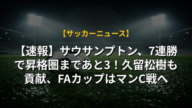 【速報】サウサンプトン、7連勝で昇格圏まであと3!久留松樹も貢献、FAカップはマンC戦へ