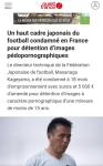 日本サッカー協会(JFA)の技術委員長、影山雅永氏(58)は、フランスのパリ近郊で児童ポルノ画像所持の罪で有罪判決を受け、執行猶予付き懲役18カ月と罰金5000ユーロ(約85万円)を言い渡された。影山氏は日本からチリへ向かう途中、パリのロワシー・シャルル・ド・ゴール空港で逮捕された。客室乗務員がエールフランスのビジネスクラスで影山氏がノートパソコンで児童ポルノ画像を見ているのを目撃し、通報された。