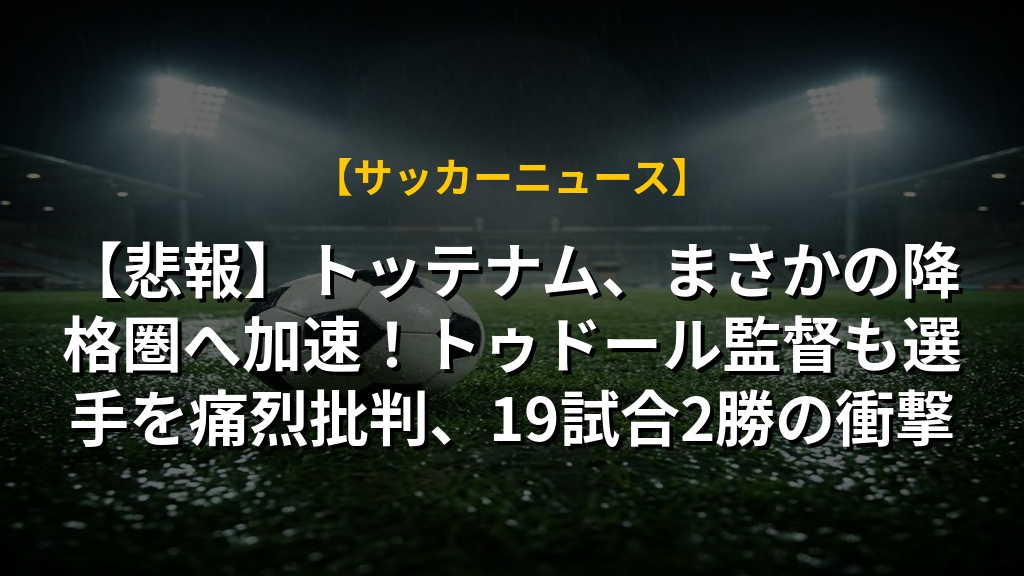 - トッテナムの現状は降格圏との差が縮小。負けが込み、直近19試合でわずか2勝と低迷しており、降格の可能性も現実味を帯びている。