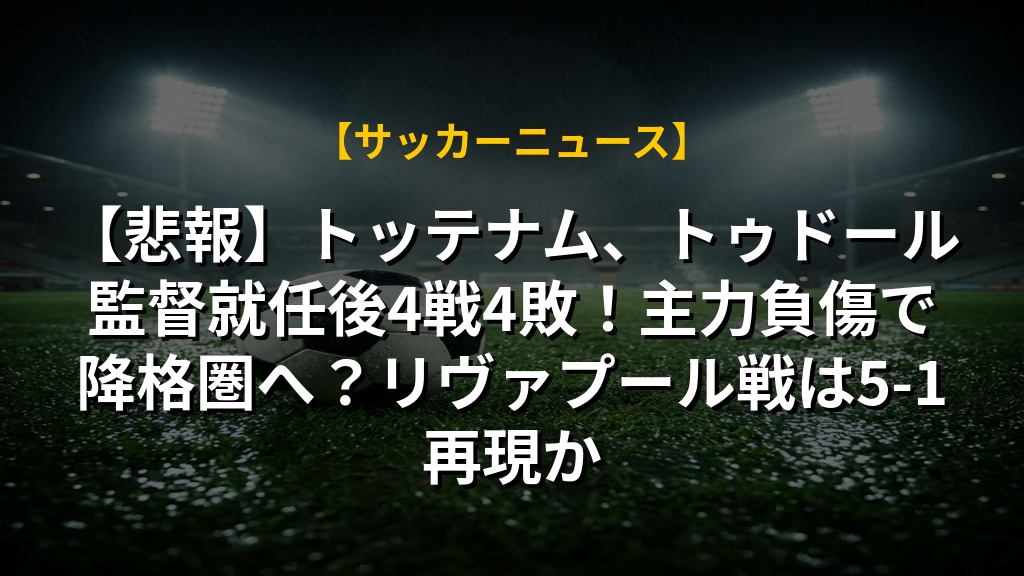 - トッテナムは主力選手が複数欠場しており、降格圏に沈む可能性も。守備陣の負傷と退場が痛手。