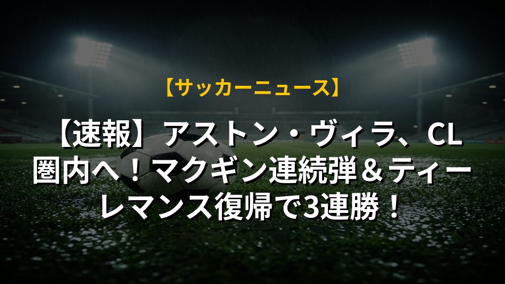 【速報】アストン・ヴィラ、CL圏内へ!マクギン連続弾&ティーレマンス復帰で3連勝!