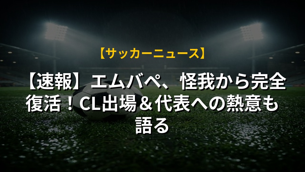 エムバペ選手が膝の怪我から完全回復を公表し、復帰が間近です。不正確な情報も多かった中、自身の言葉で状態を説明し、ファンも安心しましたね。また、フランス代表への強い想いも語り、常に代表でプレーしたいという意思表示は、今後の代表戦がさらに楽しみになる要素です。