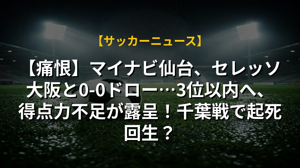 マイナビ仙台は、ホームでセレッソ大阪と0-0の引き分けに終わり、3位以内への道が険しくなりました。攻撃陣は決定力に欠き、特に矢形選手はチャンスを活かせなかったことを課題としています。しかし、4試合連続無失点と守備は堅調で、須永監督は戦力不足を成長の機会と捉えています。