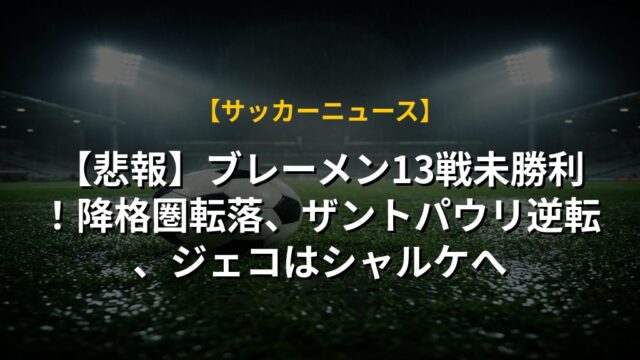 【悲報】ブレーメン13戦未勝利!降格圏転落、ザントパウリ逆転、ジェコはシャルケへ
