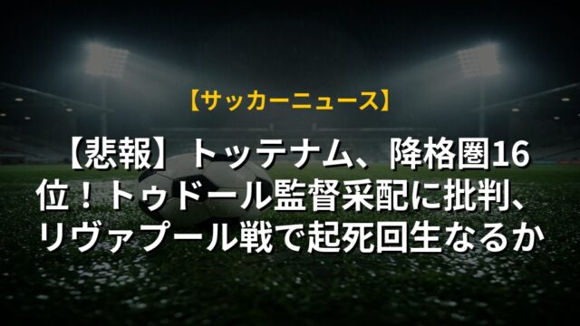 【悲報】トッテナム、降格圏16位!トゥドール監督采配に批判、リヴァプール戦で起死回生なるか