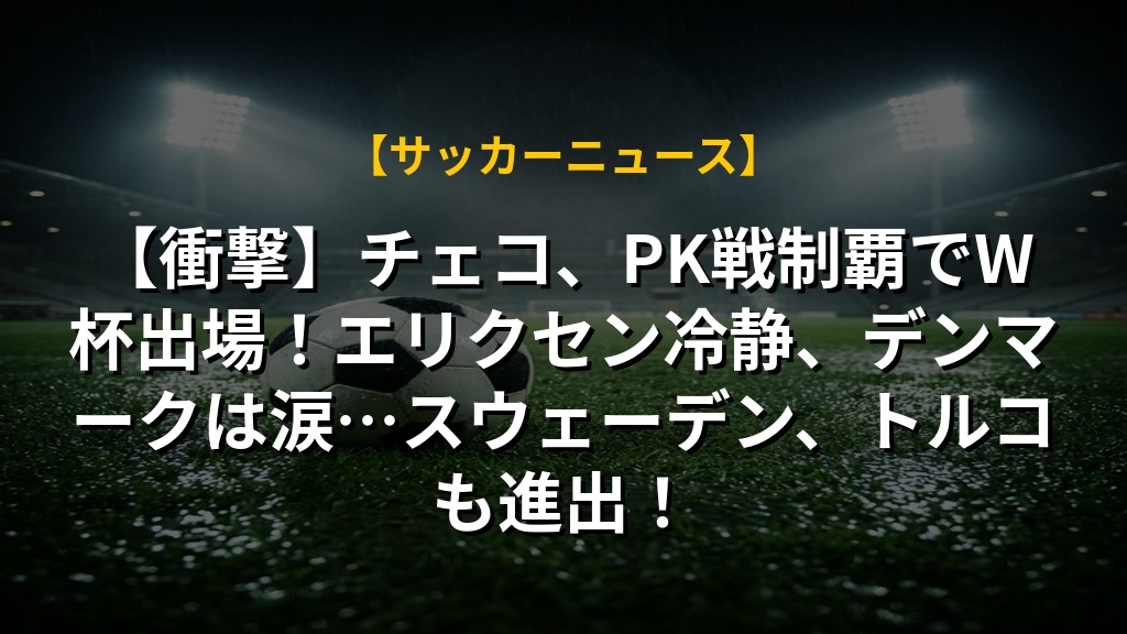 チェコが激戦の末、PK戦でデンマークを破りワールドカップ出場権を獲得しました。試合は2-2の壮絶な打ち合いとなり、両チームの意地と気迫がぶつかり合いました。特に、デンマークのエリクセン選手のPK戦での冷静な決断は、彼の復活を象徴する感動的なシーンでした。
