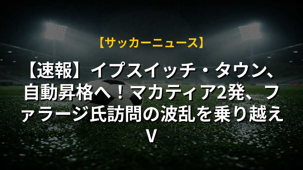 【速報】イプスイッチ・タウン、自動昇格へ!マカティア2発、ファラージ氏訪問の波乱を乗り越えV