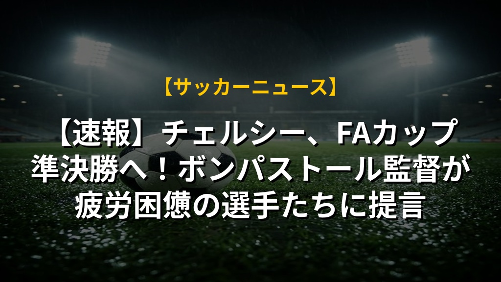 チェルシーがFAカップ準決勝に進出しましたね!過密日程の中、トッテナムとの激戦を制した選手たちに、ソンヤ・ボンパストール監督は労いの言葉をかけつつ、代表監督への配慮を訴えています。チャンピオンズリーグ敗退後の立て直しは見事で、今シーズン唯一のタイトル獲得に向けて、チームの勢いが気になります。対するトッテナムも、敗戦から立ち直る姿勢が素晴らしいです。選手の疲労管理が今後の鍵となりますが、チェルシーのFAカップ制覇に期待したいです。