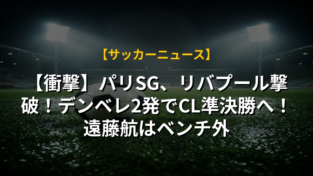 パリSGがリバプールとのCL準々決勝を2戦合計4-0で制し、3大会連続の準決勝進出を果たしました。デンベレ選手の2ゴールが光り、連覇へ大きく前進しています。リバプールの遠藤選手は残念ながらベンチ外のまま。