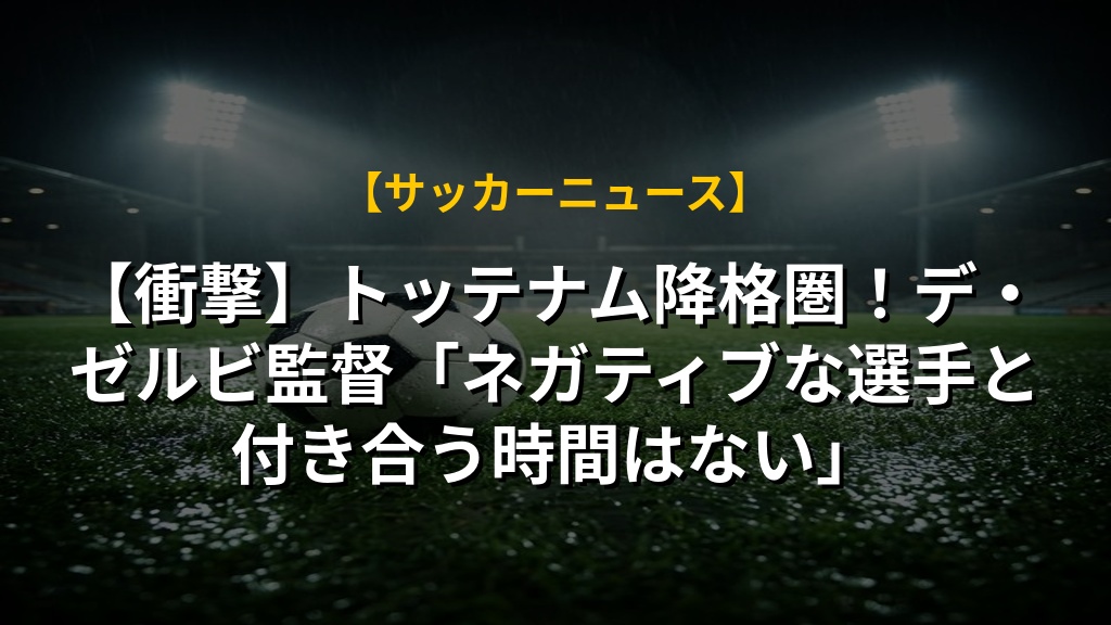 トッテナムのデ・ゼルビ監督が、チームにネガティブな選手は不要だと強く警告しましたね。降格圏脱出のチャンスを逃した苦しい状況ですが、監督は選手の質を信じ、残り5試合の勝利を諦めていません。ただ、そのためには選手一人ひとりが前向きな姿勢で臨むことが不可欠だと強調しています。