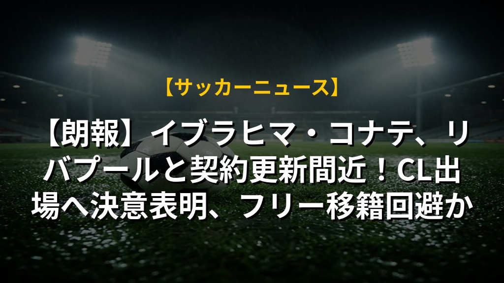 リバプールのコナテ選手が契約更新に近づいているという嬉しいニュースです。昨シーズンは私的な苦難もありましたが、チームへの献身は変わらず、ニューカッスル戦でのゴールはファンにとっても感動的でした。フリー移籍の可能性も危惧されていましたが、クラブとの合意が間近に迫っているようで安心です。クロップ監督の後継者となる新体制下での安定したディフェンスライン構築に、コナテ選手の存在は不可欠です。まずはチャンピオンズリーグ出場権獲得に向けて、共に戦えることを願っています。