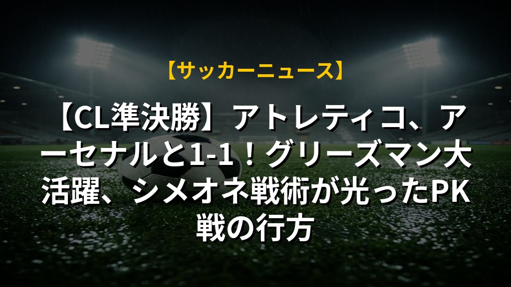 アトレティコ・マドリードとアーセナルのCL準決勝第1戦は、1-1の引き分けとなりました。ホームのアトレティコはグリーズマンを中心に攻めましたが、アーセナルもPKで応戦し、互角の戦いを見せました。シメオネ監督の戦術が効果的だった一方で、アーセナルもアウェイでPK獲得と可能性を見せています。